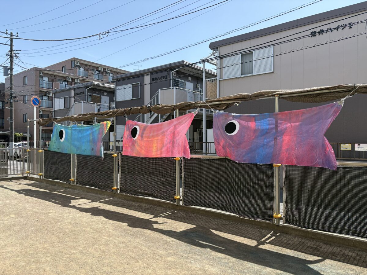 smile4月 2026.04.22 ブログ ばら組、ゆり組、ひまわり組のみんなで 大きなこいのぼりを作りました。 裸足になって好きな色を選び、刷毛でのびのびと色を塗っていきました。 「あおくださーい!」「ピンクくださーい」と何度もおかわりしながら楽しむ姿が見られました✨ いつもと少し違うダイナミックな体験を楽しみながら、 みんなの色が重り合った素敵なこいのぼりが完成しました。🎏 ひまわり組さんは、後片付けもどんどんしてくれました😊